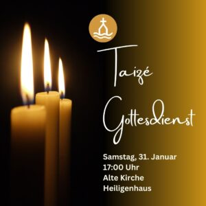 Am Samstag, dem 31. Januar feiern wir einen Taizé-Gottesdienst um 17.00 Uhr in der Alten Kirche mit Pfarrerin Kirsten Pape. Es ist ein Gottesdienst, der durch die einfachen und schönen Gesänge aus Taizé geprägt ist. Herzliche Einladung!