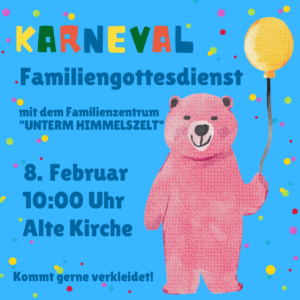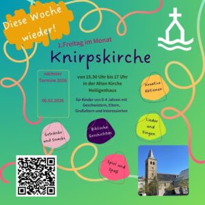 Am Freitag, dem 6. Februar um 15:30 Uhr laden wir Euch wieder zur Knirpskirche in der Alten Kirche ein. Die Knirpskirche ist ein (klein-)kindgerechter Gottesdienst mit viel Musik, einfachen Bewegungsliedern, biblischen Geschichten und kreativen Aktionen. Eigeladen sind Familien mit Kindern im Alter von 0-5 Jahren. Auch ältere Geschwister, Großeltern und