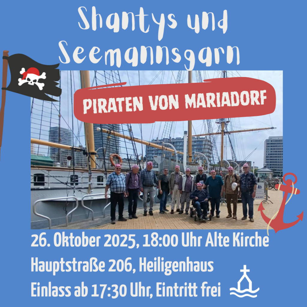 Wir laden herzlich ein zu Shantys und Seemansgarn mit den „Piraten von Mariadorf“ der evangelischen Kirchengemeinde Mariadorf am Sonntag, 26. Oktober um 18 Uhr in der Alten Kirche ein.