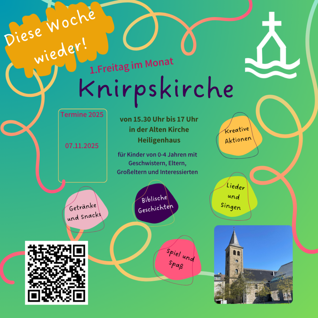 Am Freitag, dem 07. November um 15:30 Uhr laden wir Euch wieder zur Knirpskirche in der Alten Kirche ein. Die Knirpskirche ist ein (klein-)kindgerechter Gottesdienst mit viel Musik, einfachen Bewegungsliedern, biblischen Geschichten und kreativen Aktionen. Eingeladen sind Familien mit Kindern im Alter von 0-5 Jahren. Auch ältere Geschwister, Großeltern und alle Interessierten sind herzlich willkommen.