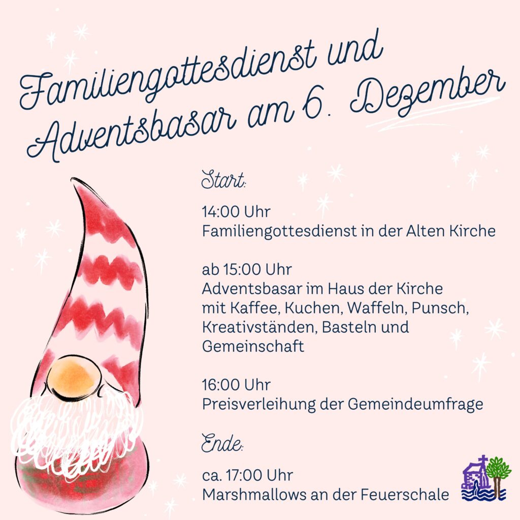 Im Haus der Kirche öffnet ab 15:00 Uhr ein kleiner Adventsbasar mit allerlei Selbstgemachtem und Leckerem wie Punsch, Waffeln und Kuchen. Um 16:00 Uhr findet die Verlosung zu unserer Gemeindeumfrage statt. Zum Abschluss gegen 17:00 Uhr lassen wir den Tag an der Feuerschale mit Marshmallows ausklingen.