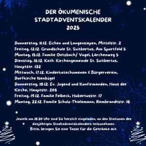Im Rahmen des ökumenischen Stadtadventskalenders laden wir am Mittwoch, 17. Dezember um 18:30 Uhr zur Dorfkirche Isenbügel ein. Unsere Kinderkatechumenen gestalten das Adventsfenster für euch. Im Anschluss gibt es Glühwein und Kinderpunsch, dazu bitte eine Tasse mitbringen.