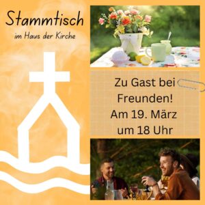 Herzliche Einladung zum nächsten Stammtisch unter dem Motto “ Zu Gast bei Freunden!“ am Donnerstag, dem 19. März ab 18 Uhr im Haus der Kirche. Neben dem Essen bleibt Zeit zum Klönen und genießen. Kommt vorbei!