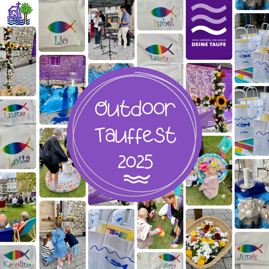 Die Taufe, dieses große, einmalige und wunderschöne Ja Gottes zum Menschen – 8 Kinder wurden am 30. August beim Outdoor Tauffest an der Alten Kirche im Pool, unterm Regenbogen und auf der Picknick Decke getauft. Zur Erinnerung an dieses wunderschöne Fest gab es für jeden Täufling eine Tauftasche mit einem T-Shirt, einem Brief und einem kleinen Fisch Handtuch. Auch in 2026 planen wir ein großes Tauffest. Haben Sie Interesse, dann sprechen Sie die Pfarrerinnen an!