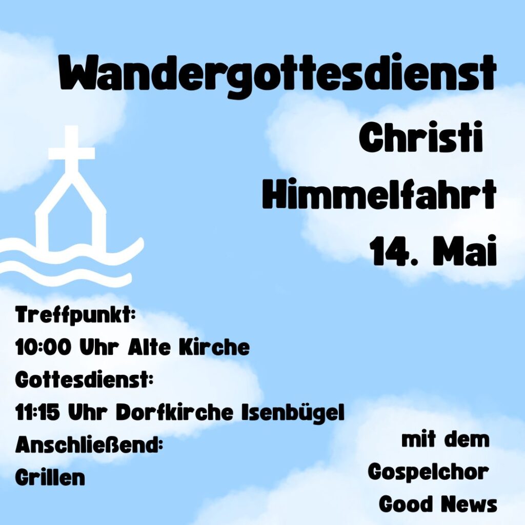 Am Himmelfahrtstag, 14. Mai geht es zu Fuß von der Alten Kirche nach Isenbügel, dort feiern wir um 11:15 Uhr in der Dorfkirche einen Gottesdienst für die ganze Familie mit unserem Gospelchor „Good News“. Anschließend freuen wir uns auf ein fröhliches Beisammensein und Grillen. Treffpunkt für alle Wanderer ist 10:00 Uhr Alte Kirche Heiligenhaus. Dort stehen auch PKW’s für alle bereit, die nicht so gut zu Fuß sind. Für die Isenbügeler, die mit wandern wollen, gibt es die Möglichkeit eines Fahrdienstes ab Dorfkirche. Dazu bitte Anmeldung bei Kirsten Düsterhöft unter 02056/5993260. Zurück geht es dann nach einer Stärkung am Grill wieder zu Fuß oder mit dem PKW. Wir freuen uns auf eine schöne Wanderung bei hoffentlich sonnigem Wetter.