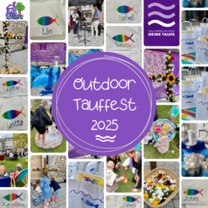 Die Taufe, dieses große, einmalige und wunderschöne Ja Gottes zum Menschen – 8 Kinder wurden am 30. August beim Outdoor Tauffest an der Alten Kirche im Pool, unterm Regenbogen und auf der Picknick Decke getauft. Zur Erinnerung an dieses wunderschöne Fest gab es für jeden Täufling eine Tauftasche mit einem